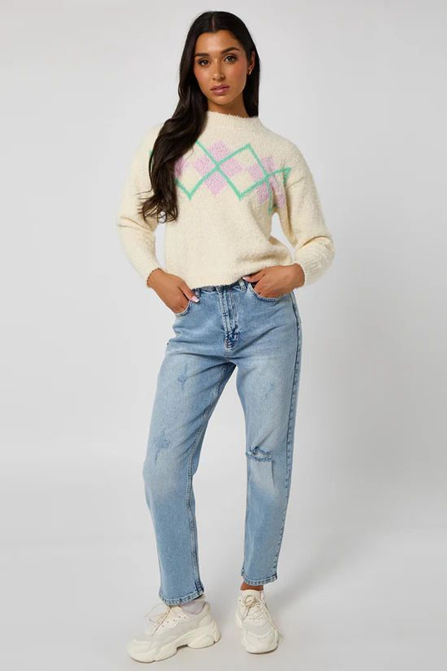 The Boucle Argyle Jumper features a soft, fluffy boucle texture paired with a pastel argyle diamond design across the chest for a fresh, modern twist on a classic pattern. Cut in an easy, relaxed fit with ribbed cuffs and hem, this jumper is perfect for everyday wear — whether you’re heading out for coffee, strolling town or layering up on cooler days.